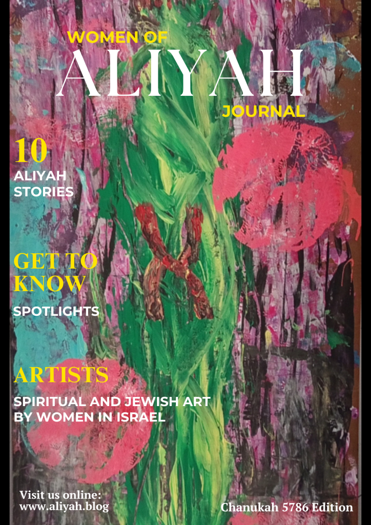 The Women of Aliyah Journal is a place for stories, essays, poetry, and art created by women who have made Aliyah. Each section reflects the many dimensions of our lives — body, mind, spirit, home, and community.